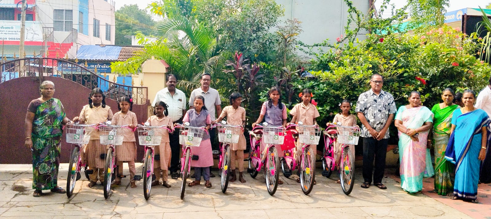 PMSSS, with support from Interlife Onlus, distributed free bicycles to 125 deserving girl students from Classes VI–IX across all working blocks of Pudukkottai District. Beneficiaries were selected based on criteria such as low-income status, long distance from school, lack of transport facilities, single-parent households, and having differently abled parents.The initiative helped reduce absenteeism, improved school attendance, and enhanced the mobility, confidence, and independence of girl children, thereby promoting gender equality and better access to education.